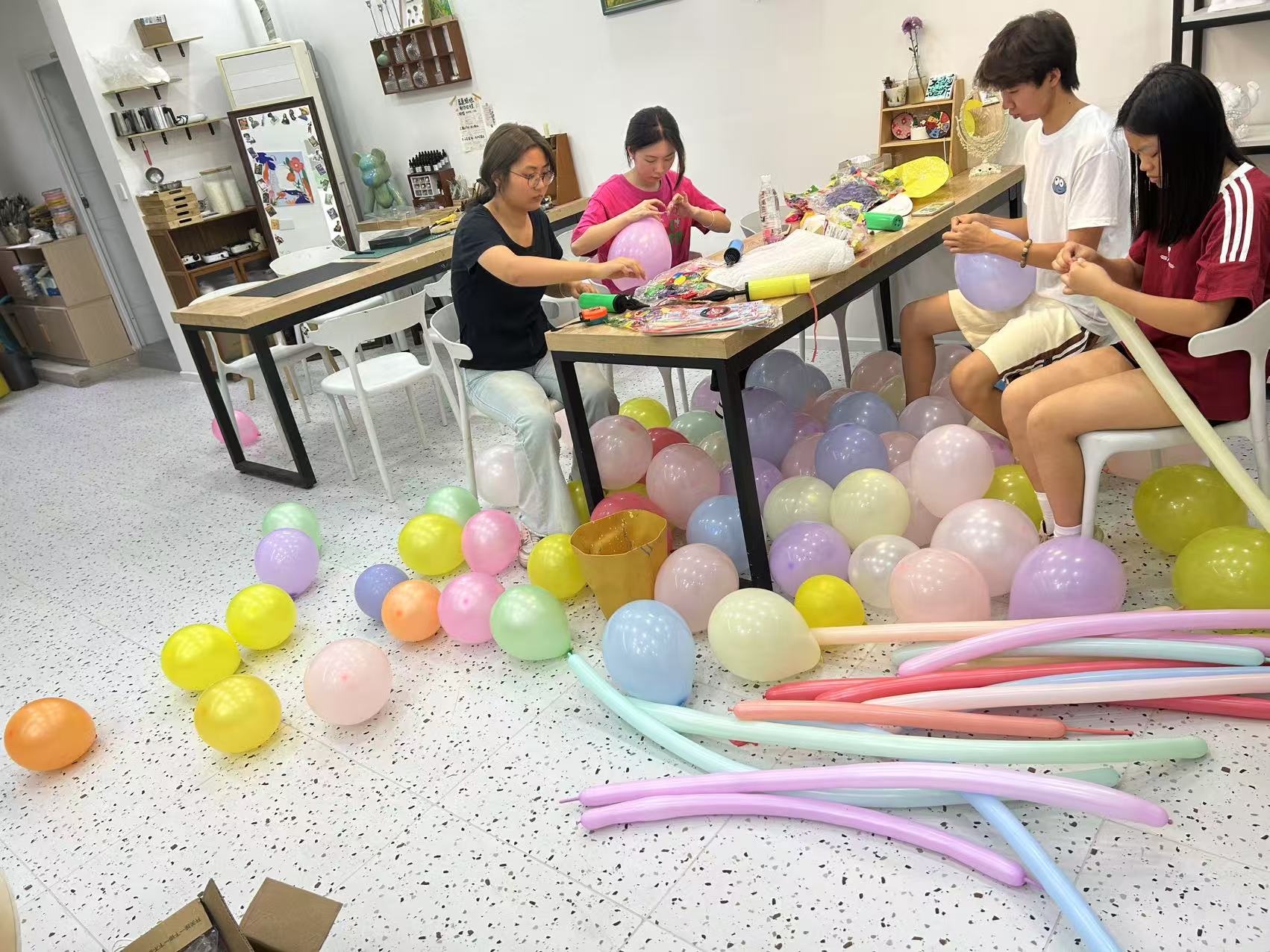 (教师教育学院的志愿者们提前一天和手工作坊的工作人员们布置现场)