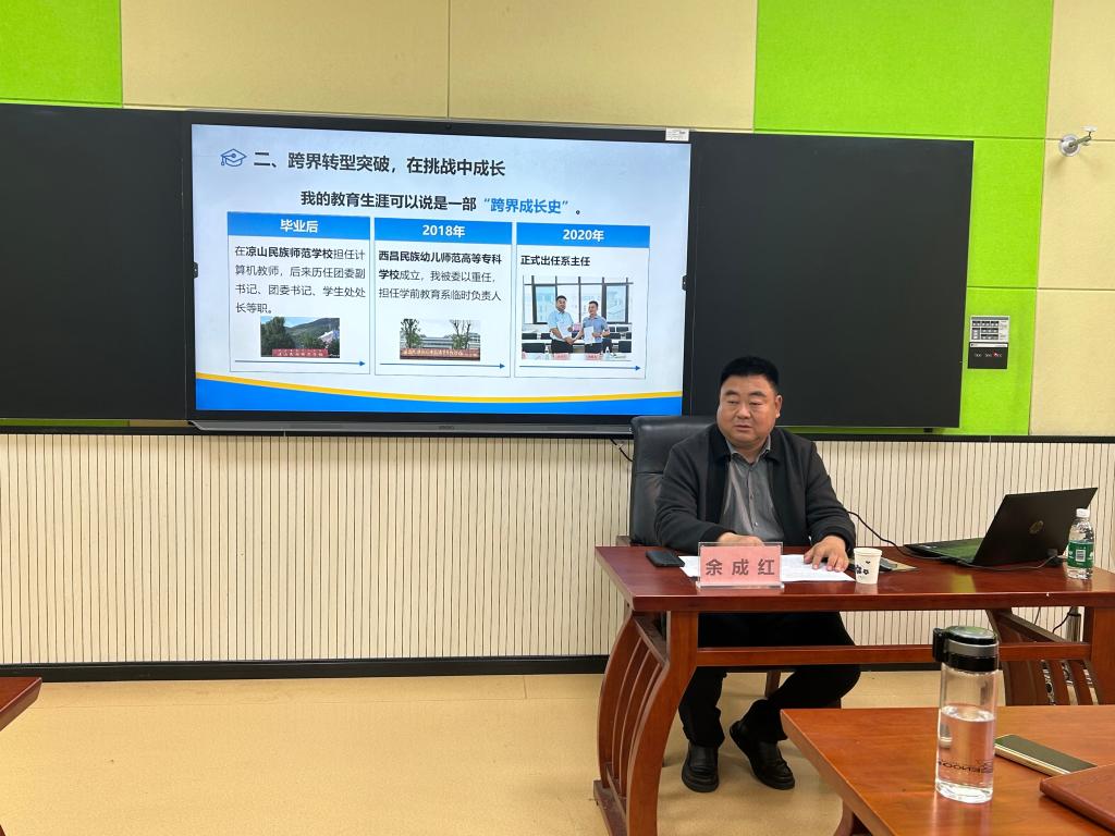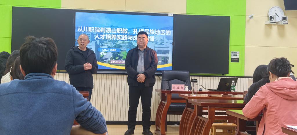 下午,余成红以《从川职院到凉山职教——扎根民族地区的人才培养实践与成长感悟》为题作专题讲座,他从“感恩母校培育,跨界转型突破,创新育人模式,深耕民族教育,坚守廉洁底线,寄语青年教师”六个维度分享个人发展和专业建设的点点滴滴,为青年教师专业发展和教育类专业转型给予了深刻启示。随后的联合教研环节,我院学前教育和早期教育负责人何知晓、熊欢分别介绍了学前教育、早期教育专业的发展概况,重点介绍了专业群“一线贯穿·三能进阶·多维融合”的人才培养模式改革和“学院-专业/教研室-课程小组”三级教研实践经验。西昌民族幼专学前教育教研室主任刘茂媛、奉双全老师交流了教学成果奖申报、专业发展规划等内容。双方共同就课程体系优化、教学模式改革和实训室建设等问题深入研讨,明确了专业问题所在,提出改进建议。