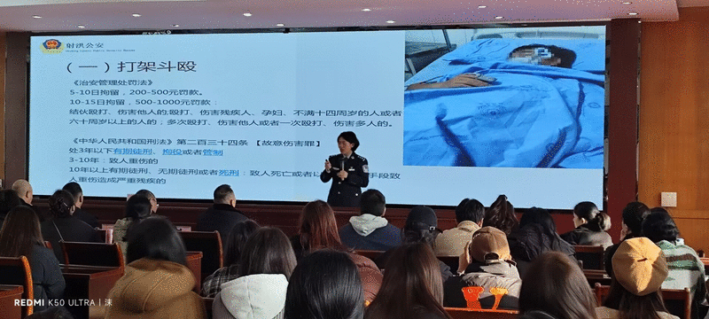 射洪市公安局民警、童卫四川公益宣讲师、省公安厅“十佳公安宣传舆论理论教官”邓涛围绕“大学生可能遭受的侵害、涉及的违法犯罪和在校期间应该怎么做”三个方面,结合真实案例、借助流行热梗、热门短视频,通过PPT的形式生动形象地向学生们讲解了近几年来各大高校学生涉及的威胁性侵、涉毒涉诈、校园贷、网络造谣、“两卡”犯罪等案例,告诫同学们务必引以为戒,进一步提升大学生的法治意识。