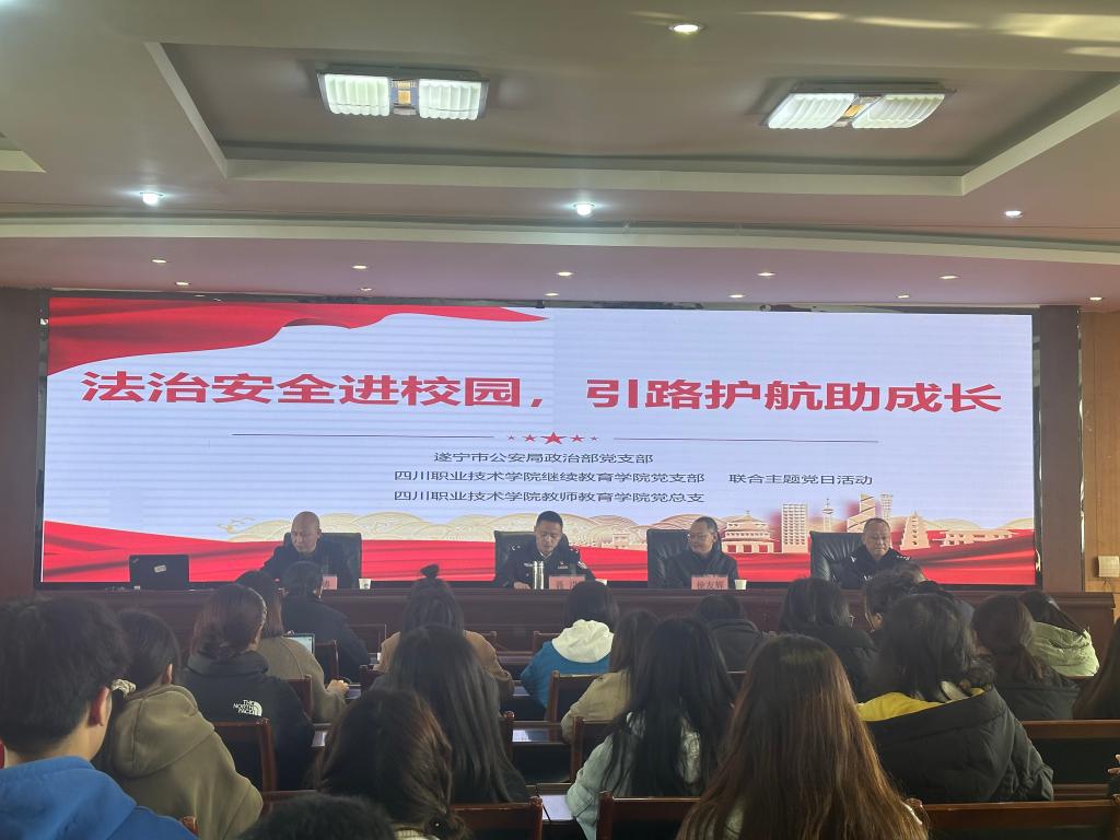 为进一步加强校园安全法治宣传教育,增强广大师生法治意识,共建平安校园,不断推动法治思想深入校园、深入人心,全面营造平安、文明、和谐的校园环境,12月7日下午,四川职业技术学院教师教育学院党总支、继续教育学院党支部与遂宁市公安局政治部党支部联合开展了“法制安全进校园,引路护航助成长”主题党日活动。遂宁市公安局政治部主任聂洪在联合主题党日活动上强调要以党建促业务,推动各项工作深入开展,不断促进警校合作共育的深度和广度,真正做到“法治安全进校园、引路护航助成长”。