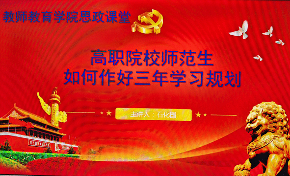为充分发挥高校“思政第一课”铸魂育人的关键作用,进一步引导青年大学生树立正确的世界观、人生观和价值观,3月11日晚,在射洪校区学术报告厅,教师教育学院院长石化国教授向2023级学生讲授了一趟主题为:“高职院校师范生如何作好三年学习规划”的思政课,旨在帮助学生系好专业成长路上的第一粒扣子。辅导员毛艺洁带领300余名学生聆听了本堂课。
