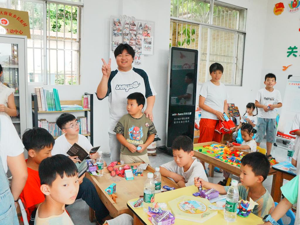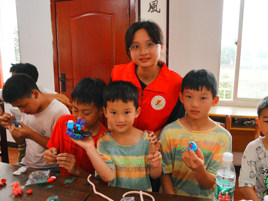 室外骄阳似火,在长虹村委会办公室内,志愿者们为孩子们精心准备的各类游戏活动也如火如荼的进行着。在玩破冰游戏之自我介绍时,孩子们因害羞、紧张地说不出一句话,在志愿者老师们不断鼓励和互动下,他们终于克服困难、卸下戒备,大方的介绍了自己的家庭情况。在趣味英语唱跳环节时,老师带领着孩子们,跟着音乐的节奏,欢快地跳动着,现场充满了欢声笑语,孩子们大胆地展现出自己童真无邪的一面。在创意手工课上,志愿者们为了激发孩子们的想象力、创造力和创新性,让他们用手中的粘土、石膏娃娃和扭扭棒,制作出了一个个精美的手工作品,每个人的脸上洋溢着久违的开心与惊喜。