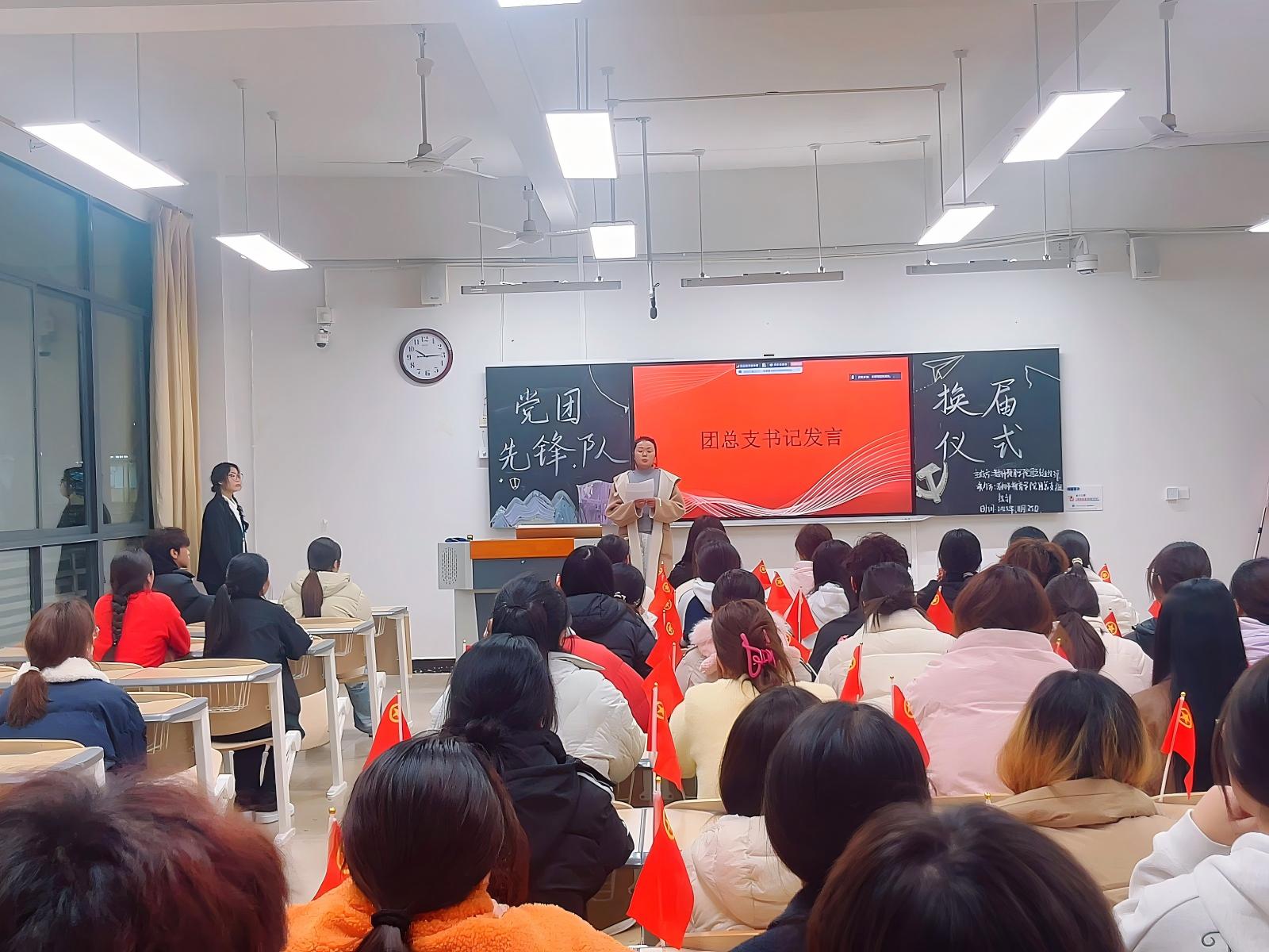 新任队长董艳伊紧接着上台做表态发言。她表示,接过接力棒,以高度的责任感和饱满的热情投入工作,带领队员们创新工作方法、丰富活动形式,积极发挥党团先锋队的模范带头作用,为学院发展贡献青春力量,言语间充满坚定与担当。