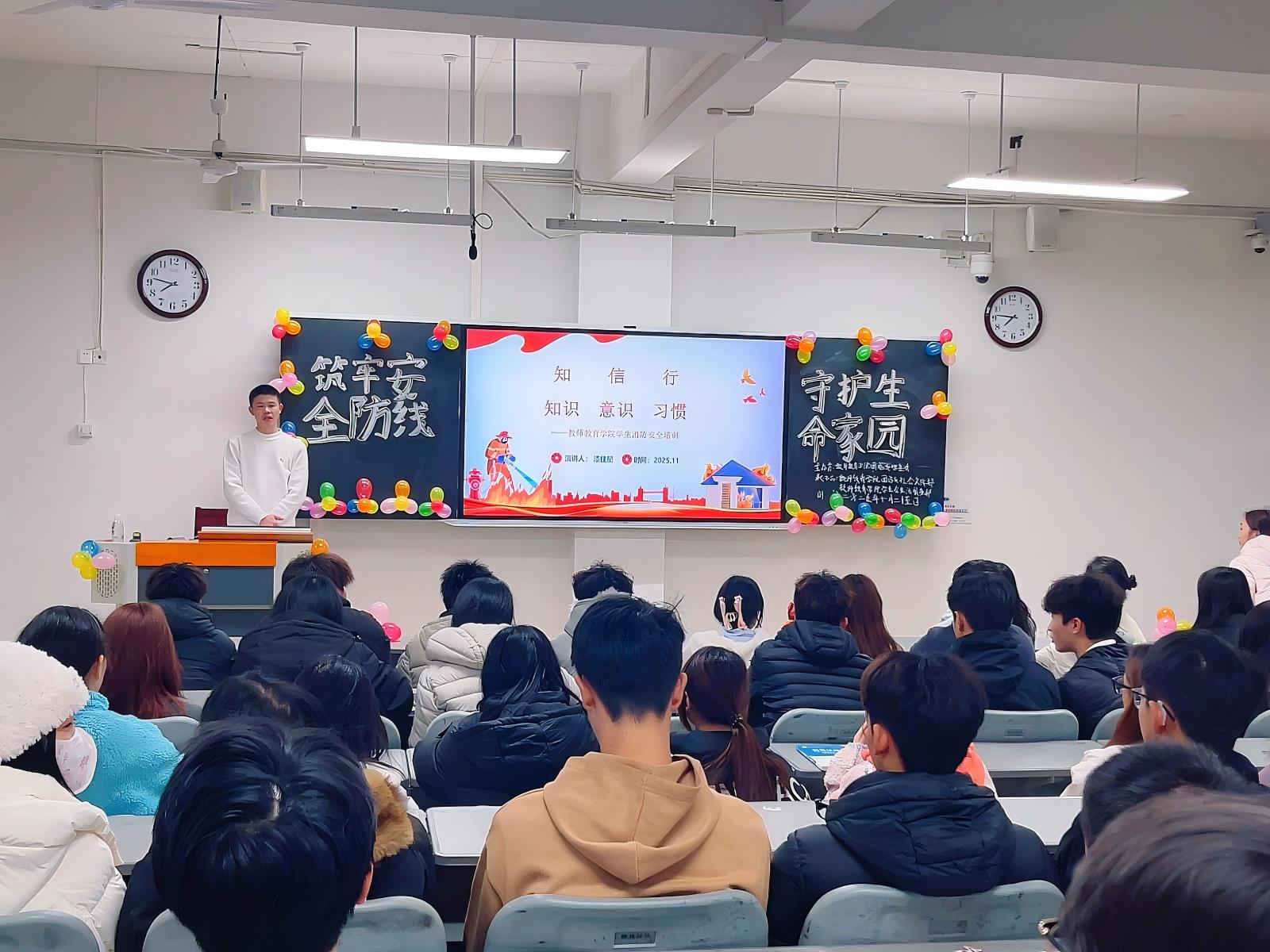 为强化学生消防安全意识,普及消防实用知识,切实筑牢校园安全屏障,2025年11月25日晚,由教师教育学院团总支主办的“筑牢安全防线,守护生命家园”消防知识讲座在尚学楼 A103 教室顺利开展。团总支书记李冬梅、辅导员漆佳星、教学助管员柴佳及学院部分同学共同参与本次活动。