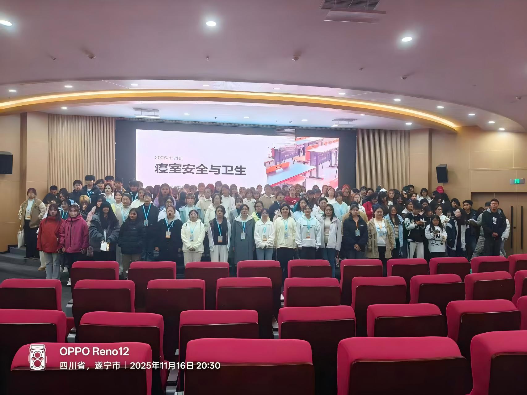 11月16日晚,2025年秋季学期学生安全教育培训暨寝室长大会在射洪校区图书馆二楼学术报告厅隆重举行。教师教育学院团总支书记李冬梅、2025级全体寝室长和班级代表200余人参加本次活动。活动由教师教育学院团总支学生会生活服务部负责人张瑞敏主持。