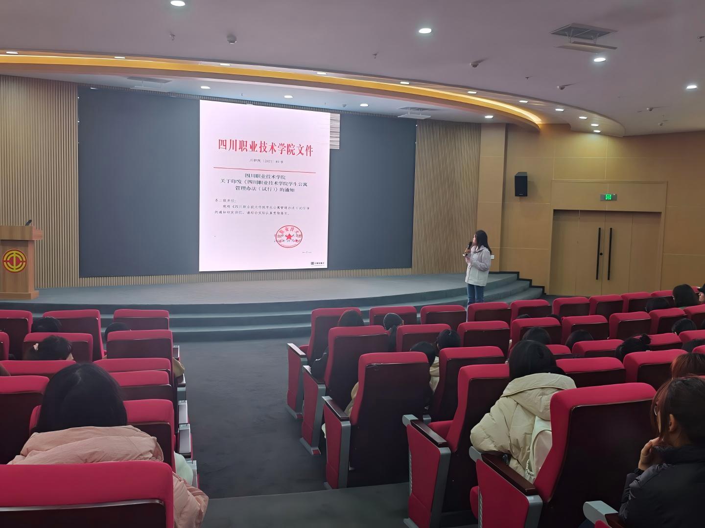大会第二项议程,由李冬梅老师为2025级全体寝室长开展安全教育培训。培训紧扣学校新修订的《四川职业技术学院学生公寓管理办法(试行)》核心文件精神,结合消防宣传教育月活动要求,同时针对近期学生寝室内务检查中发现的问题,从制度遵守、消防安全、内务规范等方面进行全面讲解与指导。