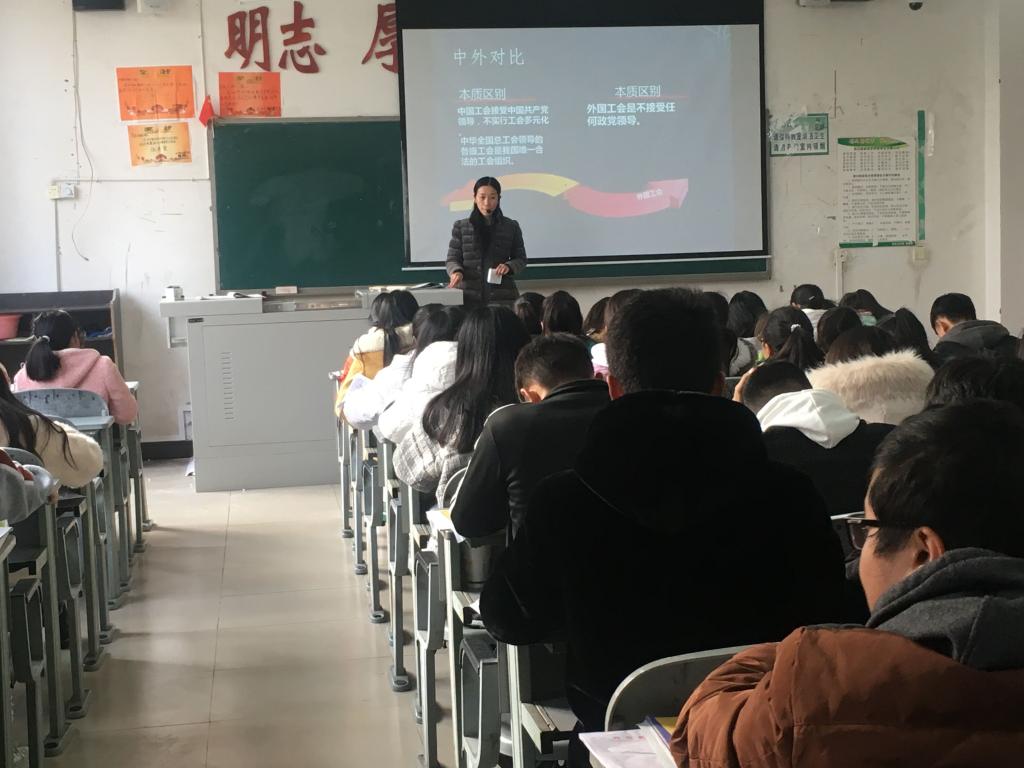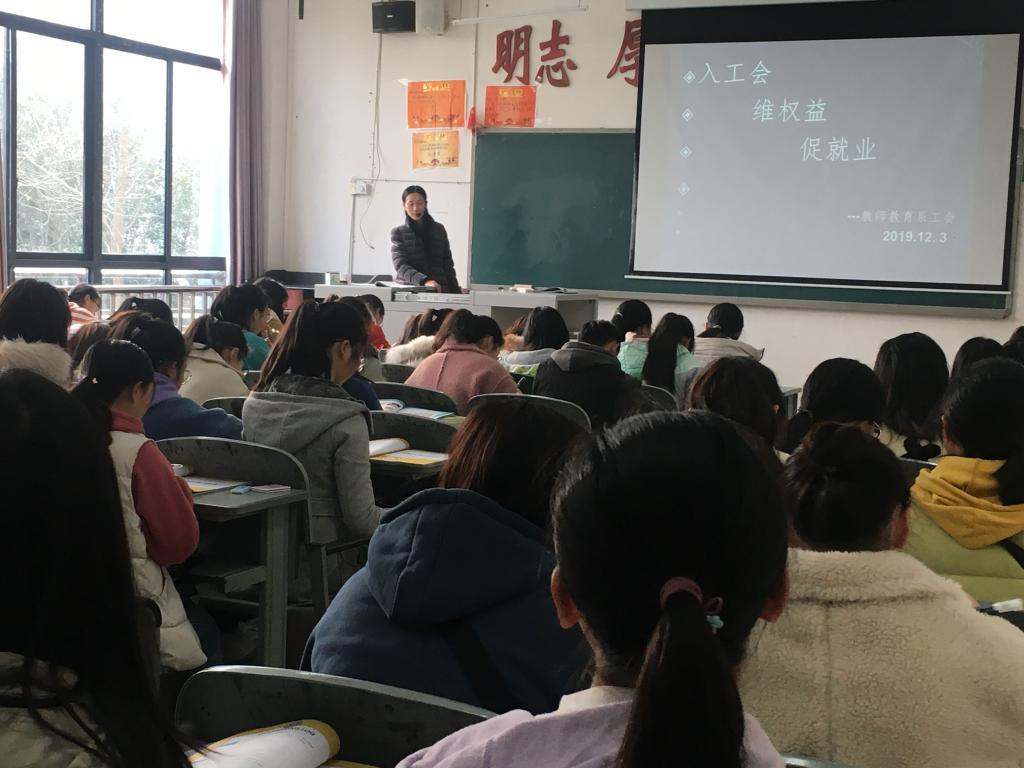 为使我校学子更深入了解工会知识,让应届大学毕业生更好地了解并适应社会生活和工作岗位,尽快实现由“学校人”向“社会人”的角色转变,2019年12月3日,我系工会组织在校学生,特别是对2017级数教专业的学生在C107教室进行了以“入工会、维权益、促就业”为主题的工会知识宣传。