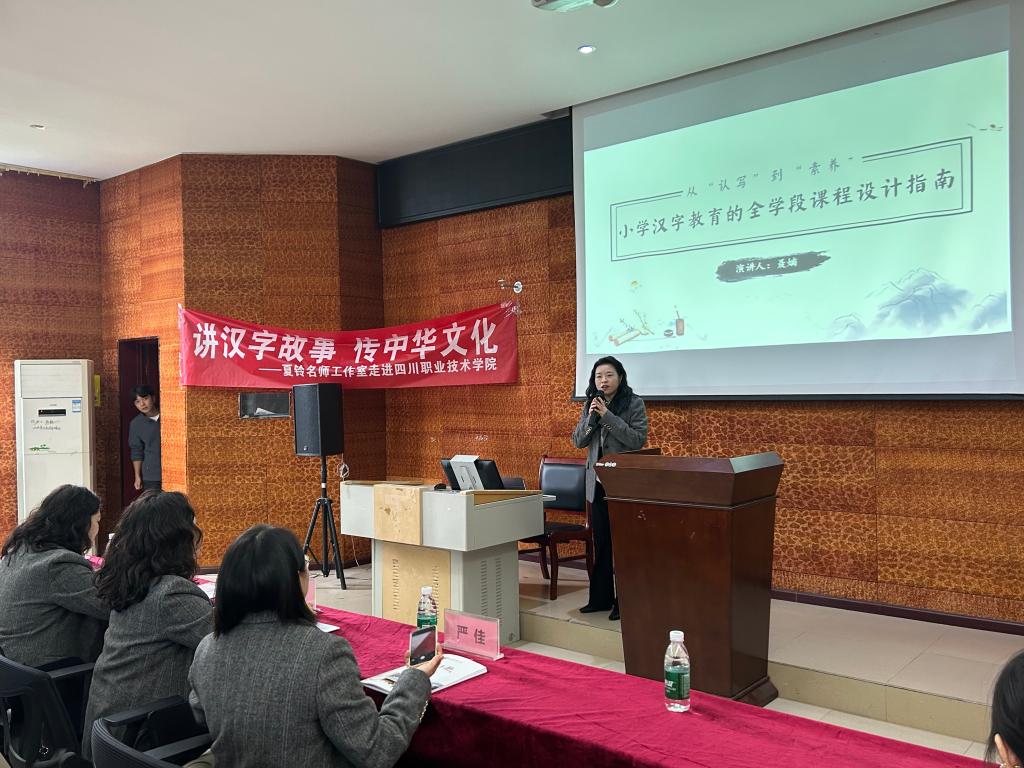 10月21日下午,四川职业技术学院明志楼多功能鉴赏厅内座无虚席,遂宁市高升实验小学校“夏铃名师工作室”一行受邀走进我校,为我院2023级小教专业200余名学子开带来了一场“讲汉字故事,传中华文化”的精彩讲座,分享了她们在一线教学中的创新理念和实践成果。