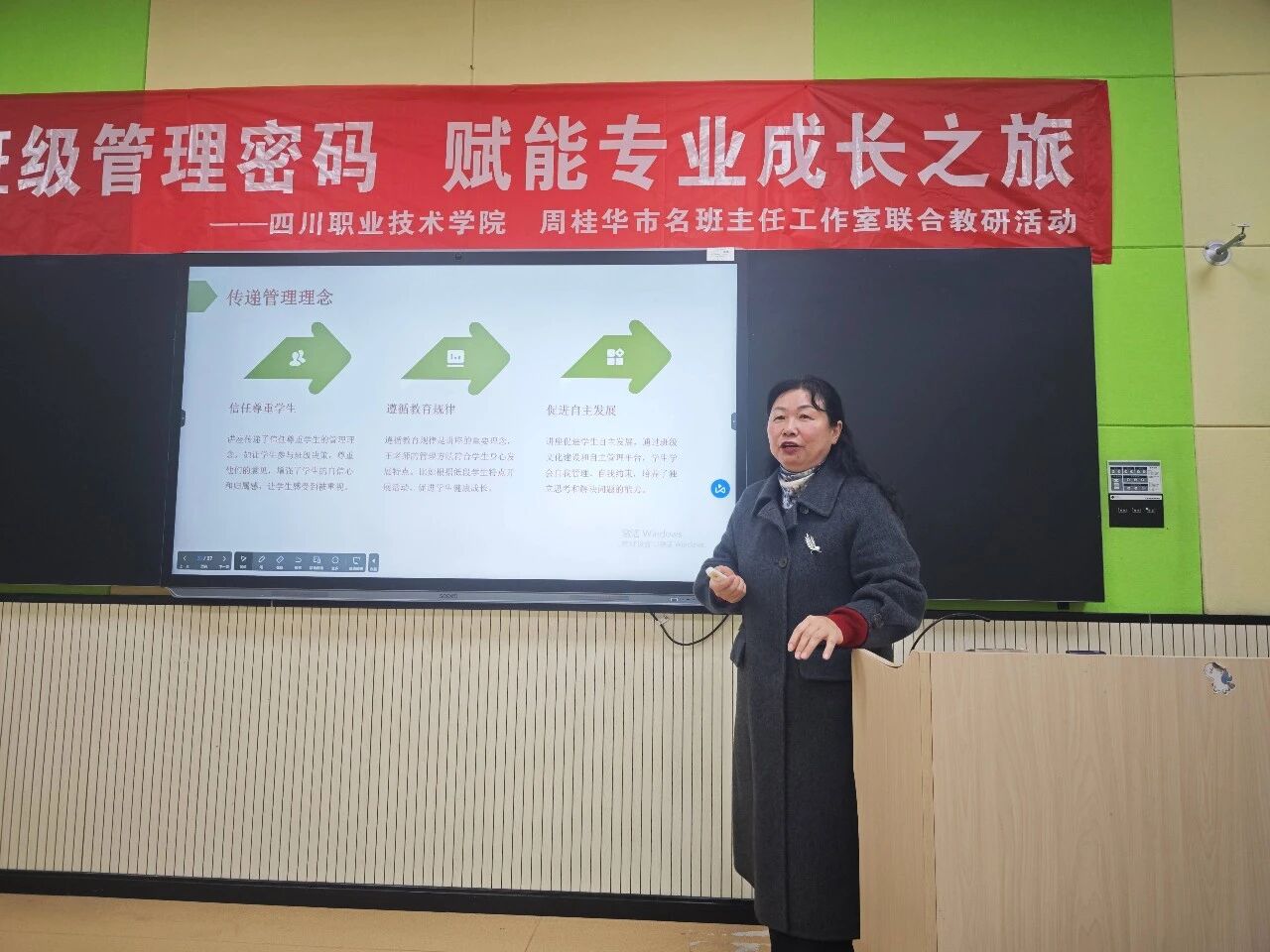 为深化基础教育与高等教育的衔接,扎实提升师范类学生班主任班级管理能力。遂宁市高升实小周桂华名师工作室于12月12日走进四川职业技术学院,开展“解锁班级管理密码,赋能专业成长之旅”主题交流活动。本次活动由教师教育学院主办,吸引了该校近百余名师范专业师生参与,现场反响热烈。